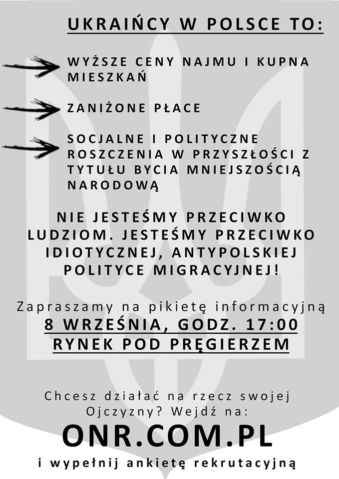 Od 2014 roku ilość Ukraińców w Polsce drastycznie rośnie. Widzimy ich u nas na uczelniach, w pracach, na ulicach. Płacimy za ich pobyt u nas spore kwoty. Za kilka miesięcy pracy w Polsce będzie przysługiwała im emerytura. Emerytura, której my, Polacy często nie widzimy. Kto nie przyjechałby po darmowe pieniądze do sąsiedniego kraju? Na dodatek nasz rząd nie robi nic w kierunku zmiany sytuacji. Wręcz przeciwnie, zaprasza ich tu jeszcze więcej obiecując kolejne świadczenia socjalne. Musimy powiedzieć temu precedensowi stanowcze NIE, jeśli nie chcemy by zabierali nasze pieniądze przeznaczone na emerytury i renty. Zapraszamy 08.09 na godzinę 17:00 pod pręgierz, by wykrzyczeć to głośno i wszystkim, że nie zgadzamy się na taki układ.