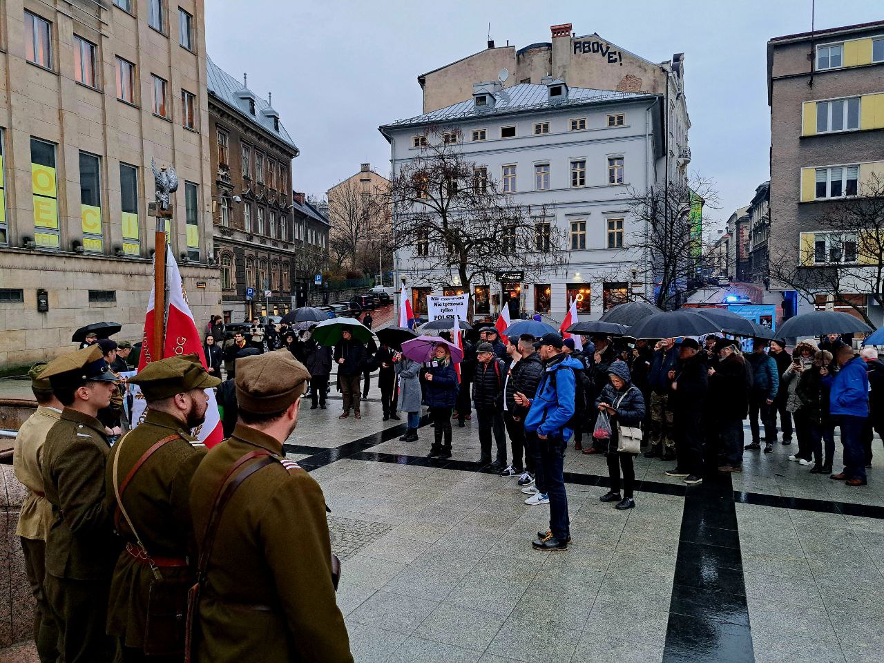 W dalszej części skandowano hasła i rozdawano ulotki. Złożyliśmy również wiązanki kwiatów pod tablicami pamięci.